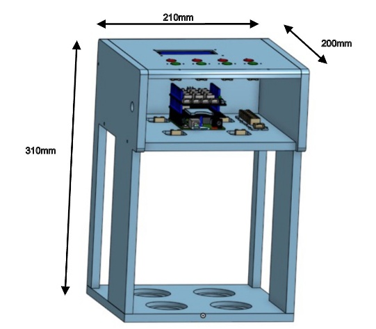 Pour la protection des composants mais aussi pour le confort d’utilisation, un boîtier adapté a été réalisé (Figure 8). La version proposée est composée de sept pièces : cinq pour la base et deux pour le couvercle. Mais de nombreuses autres configurations sont possibles. Il est néanmoins important de bien positionner les capteurs et de fixer l’ensemble des composants au boîtier. Les plans ont été réalisés sur le logiciel de dessin technique gratuit OnShape, et mis à disposition sous le nom Pou.Pâ., pour tout utilisateur qui en ferait la demande. Les plans peuvent être utilisés pour réaliser le boîtier en impression 3D, en découpe laser ou en tout autre mode d’usinage. Le boîtier fini mesure 210 mm de large par 200 mm de profondeur sur une hauteur de 310 mm. Les faces centrales et supérieures sont conçues pour permettre la fixation des composants, les autres plaques ne servant qu’à la structure, l’étanchéité et le positionnement des pâtons. La face supérieure (Figure 9) accueille les quatre boutons doubles ainsi que l’écran LCD. La face centrale sert de support à la carte Arduino, au Hub ainsi qu’à l’ensemble des capteurs. L’utilisation de boulons M2, d’écrous et d’entretoise permet leur fixation.