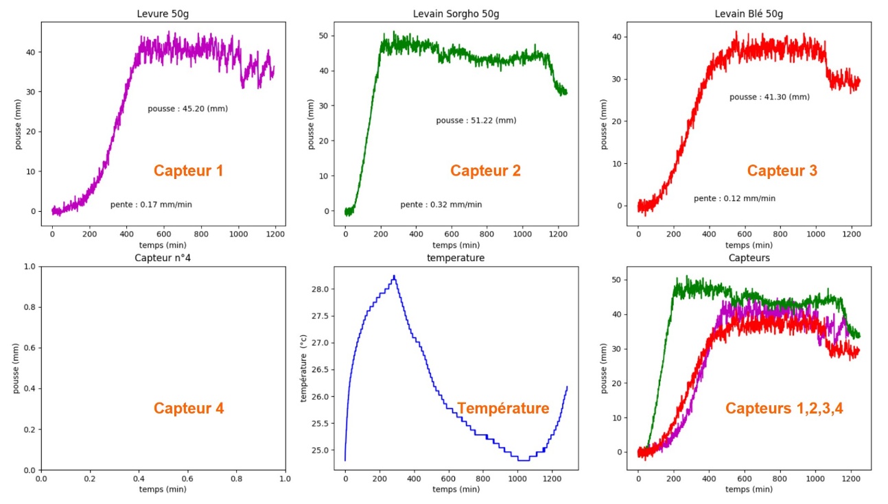 Le tracé de la figure 12 correspond à un test réalisé dans une boulangerie Montpelliéraine par l’analyse automatique du programme Python. À partir des données brutes stockées sur la carte SD, ce programme trace les courbes de pousse des capteurs individuellement (Capteurs 1 à 4), de la température mesurée au cours de l'essai (graphique température) ainsi que des quatre mesures de pousse superposées pour faciliter la comparaison. La fermentation a été réalisée avec la même recette en variant les agents de pousse : une levure boulangère (Capteur 1), un levain de sorgho (Capteur 2), et un levain de blé (Capteur 3). Le Capteur 4 n’a pas été utilisé. Les trois pâtons sont constitués au final d'un mélange de 70 % de farine de blé tendre et de 30 % de farine de sorgho, ajusté en fonction de la composition du levain. La quantité de pâton généralement utilisée est de 30 g, mais il est rapidement apparu que, pour cette expérience, 50 g serait plus adapté. De nombreux paramètres expérimentaux sont à prendre en compte pour interpréter de façon rigoureuse ces courbes. Par exemple, le choix a été fait de prendre une masse égale de pâton, mais il aurait été aussi possible de prendre un volume équivalent. Pour le test présenté ici, cela ne fait aucune différence : la composition des pâtons étant quasiment équivalente. Mais s’il s'agit de comparer des pâtons à teneur en eau variable, la question mériterait réflexion.